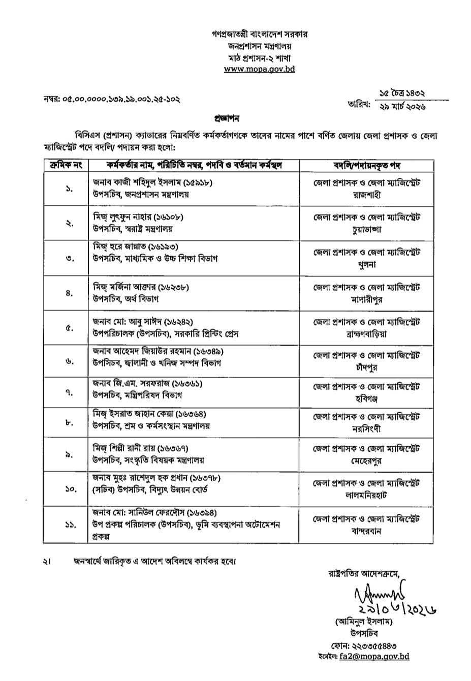 বান্দরবান পার্বত্য জেলায় নতুন জেলা প্রশাসক হিসেবে নিয়োগ দেওয়া হয়েছে ভূমি ব্যবস্থাপনা অটোমেশন প্রকল্পের সানিউল ফেরদৌসকে। আজ (রোববার, ২৯ মার্চ) জনপ্রশাসন মন্ত্রণালয়ের এক প্রজ্ঞাপন নোটিশ প্রকাশ করা হয়েছে। একই প্রজ্ঞাপনে আরও ১০ জেলায় নতুন জেলা প্রশাসক নিয়োগ দেওয়া হয়েছে। এর মধ্যে রাজশাহীতে কাজী শহিদুল ইসলাম, চুয়াডাঙ্গায় লুৎফুন নাহার, খুলনায় হুরে জান্নাত, মাদারীপুরে মর্জিনা আক্তার, ব্রাহ্মণবাড়িয়ায় আবু সাঈদ, চাঁদপুরে আহমেদ জিয়াউর রহমান, হবিগঞ্জে জি এম সরফরাজ, নরসিংদীতে ইসরাত জাহান কেয়া, মেহেরপুরে শিল্পী রানী রায় এবং লালমনিরহাটে রাশেদুল হক প্রধানকে পদায়ন করা হয়েছে।উল্লেখ্য, মাত্র এক বছরের মাথায় জেলা প্রশাসক শামীম আরা রিনিকে সরিয়ে নতুন জেলা প্রশাসক হিসেবে ভূমি ব্যবস্থাপনা অটোমেশন প্রকল্পের সানিউল ফেরদৌসকে পদায়ন করা হলো।